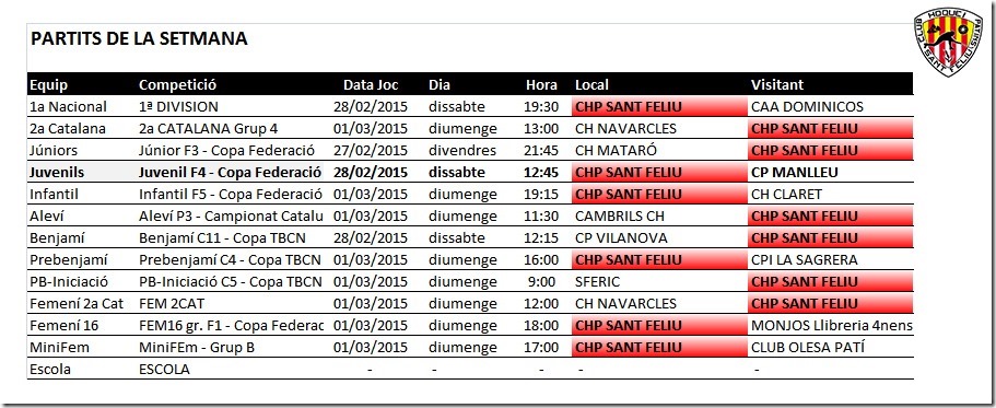 El partit del Juvenil que s’ha de jugar demà dissabte al Pavelló de Sant Feliu amb el CP Manelleu es farà a les 12:45h i no a les 17:00h com s’havia anunciat anteriorment.