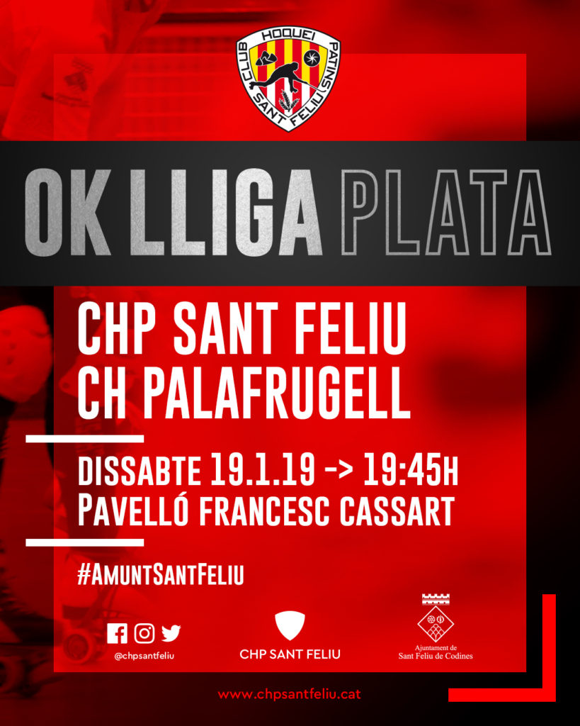 Aquest proper dissabte 19 de gener de 2019 a les 19:45h partit de hoquei patins de categoria OK Plata entre CHP SANT FELIU i CH PALAFRUGELL al nostre Pavelló municipal Francesc Cassart i Roca, a la zona esportiva de Sant Feliu de Codines.