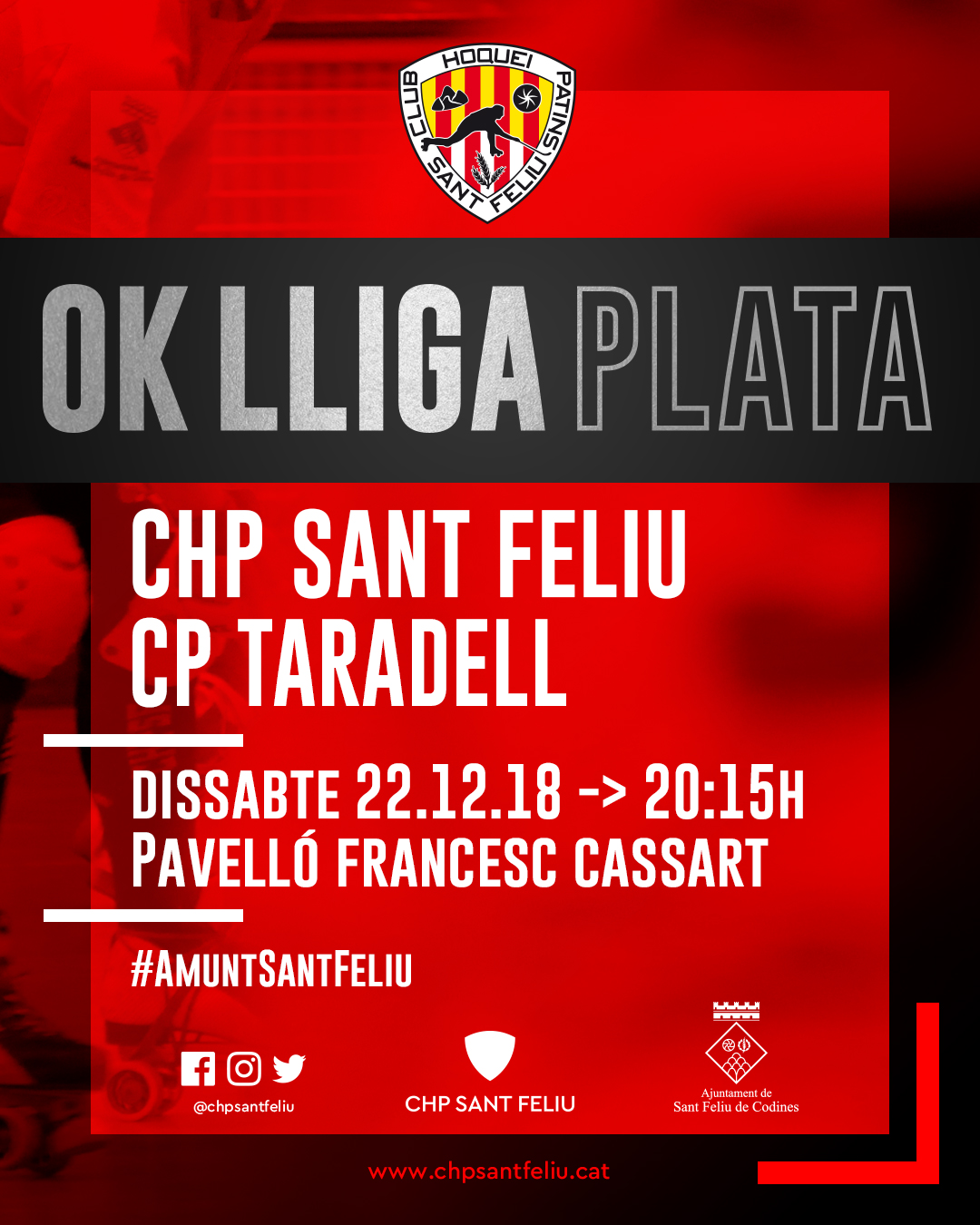 Aquest proper dissabte 22 de desembre de 2018 a les 20:15h partit de hoquei patins de categoria OK Plata entre CHP SANT FELIU vs CP TARADELL al nostre Pavelló municipal Francesc Cassart i Roca, a la zona esportiva de Sant Feliu de Codines.