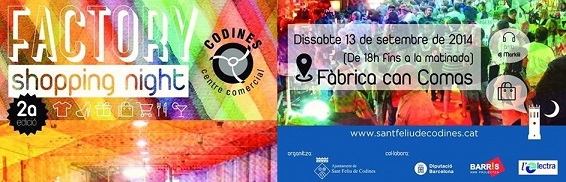 Viu una nit de festa i fes les teves compres en un espai original i creatiu, a l’antiga fàbrica de Can Comas de Sant Feliu de Codines. Gaudeix de la 2a edició del Factory Shopping Night, una activitat de dinamització comercial, que organitza l’Ajuntament amb el suport dels establiments adherits, la Diputació de Barcelona i l’ajut de Llei de Barris, sota la marca Codines Centre Comercial.