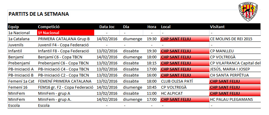 Us informem dels equips i horaris dels partits d’aquest proper cap de setmana, dissabte 13 i diumenge 14 de març.