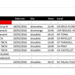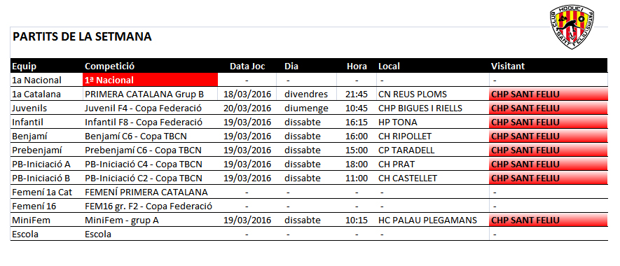 Us adjuntem els horaris dels partits d’hoquei dels equips del nostre Club del proper cap de setmana, divendres 11, dissabte 12 i diumenge 13 de març de 2016.