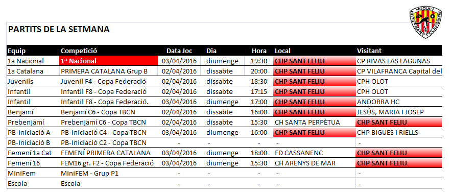 Home Calendaris i Horaris/Horaris dels partits del proper cap de setmana primer d'abril PartitsSetmana_01