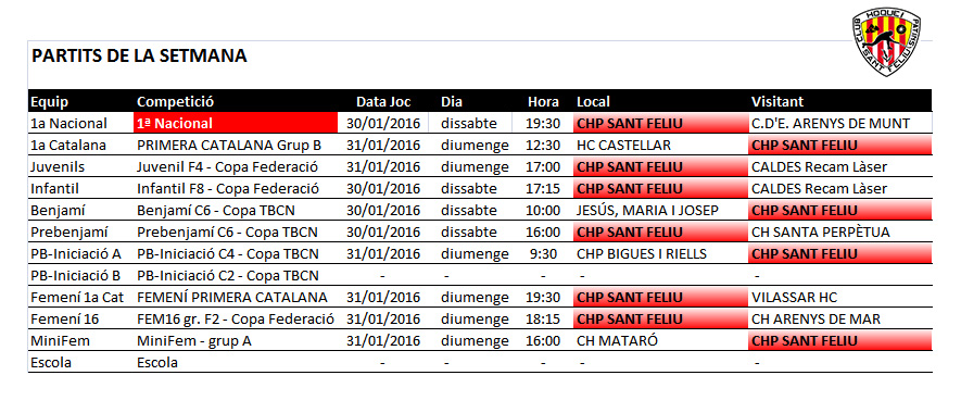 Us avancem els horaris dels partits del proper cap de setmana, dissabte 30 i diumenge 31 de gener.