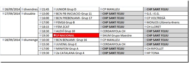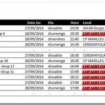 Horaris partits d’aquesta setmana, divendres26, dissabte  27 i diumenge 28 de setembre de 2014.