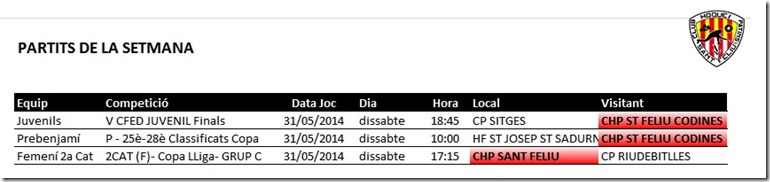Horaris partits d’aquesta setmana, dissabte 31 de maig de 2014