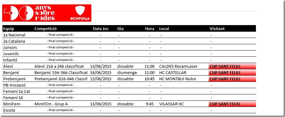 Us informem dels horaris previstos pels partits d’hoquei dels equips del nostre Club Hoquei Sant Feliu d’aquest proper cap de setmana, dissabte 13 i diumenge 14 de juny de 2015.