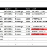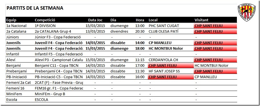 Us comuniquem els horaris previstos pels partits dels equips del nostre Club Hoquei Sant Feliu d’aquest proper cap de setmana, divendres 13, dissabte 14 i diumenge 15 de març de 2015.