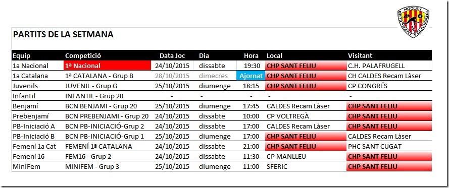 Us comuniquem els horaris previstos pels partits dels equips del nostre Club Hoquei Sant Feliu d’aquest proper cap de setmana dissabte 24 i diumenge 25 de octubre de 2015.