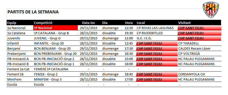 Us comuniquem els horaris previstos pels partits dels equips del nostre Club Hoquei Sant Feliu d’aquest proper cap de setmana dissabte 28 i diumenge 29 de novembre de 2015.
