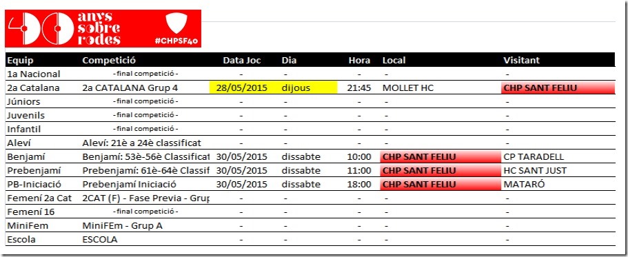 Us comuniquem els horaris previstos pels partits d’hoquei dels equips del nostre Club Hoquei Sant Feliu d’aquest proper cap de setmana, dissabte 30 i diumenge 31 de maig de 2015.