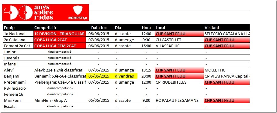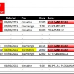 Aquí us posem els horaris previstos pels partits d’hoquei dels equips del nostre Club Hoquei Sant Feliu d’aquest proper cap de setmana, divendres 5, dissabte 6 i diumenge 7 de juny de 2015.