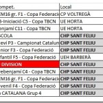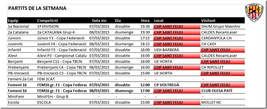 Us comuniquem els horaris previstos pels partits dels equips del nostre Club Hoquei Sant Feliu d’aquest proper cap de setmana, dissabte 7 i diumenge 8 de març de 2015.