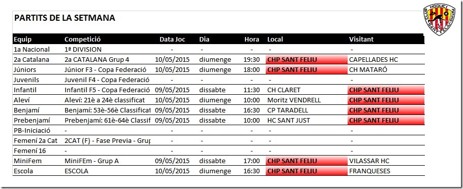 Us comuniquem els horaris previstos pels partits dels equips del nostre Club Hoquei Sant Feliu d’aquest proper cap de setmana, dissabte 9 i diumenge 10 de maig de 2015.