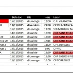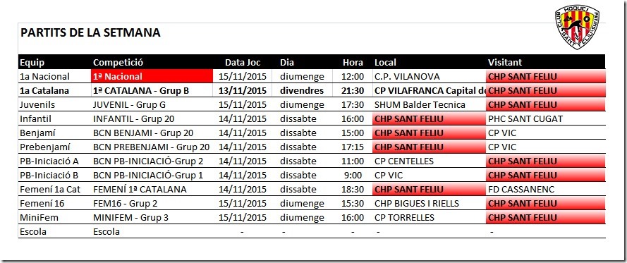 Us comuniquem els horaris previstos pels partits dels equips del nostre Club Hoquei Sant Feliu d’aquest proper cap de setmana divendres 13, dissabte 14 i diumenge 15 de novembre de 2015.