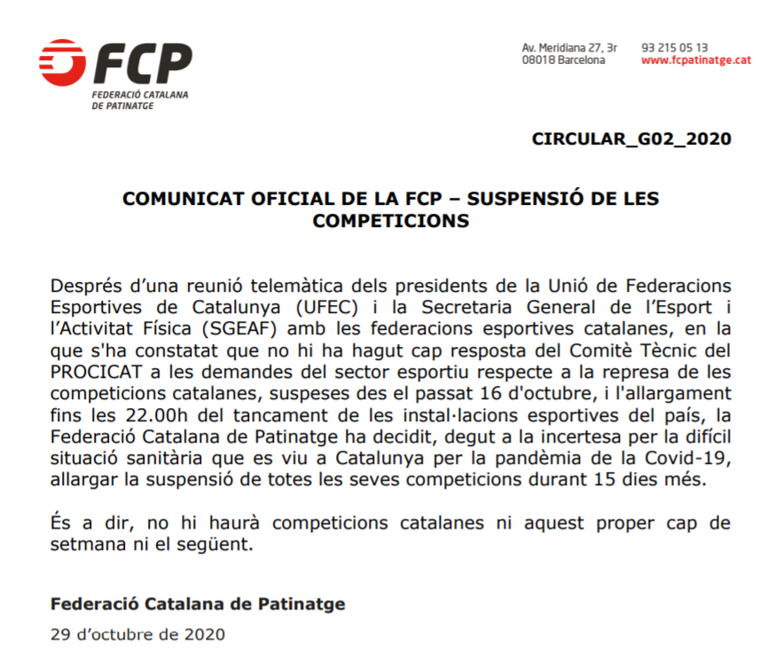 Aquest cap de setmana definitivament no hi haurà competició d’ambit català. S’atura la competició durant 15 dies.