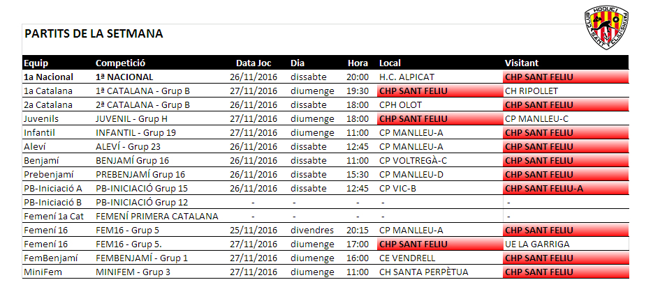 Home Calendaris i Horaris/Partits del proper cap de setmana, dissabte 26 i diumenge 27 de novembre 20161122_partitssetmana_01