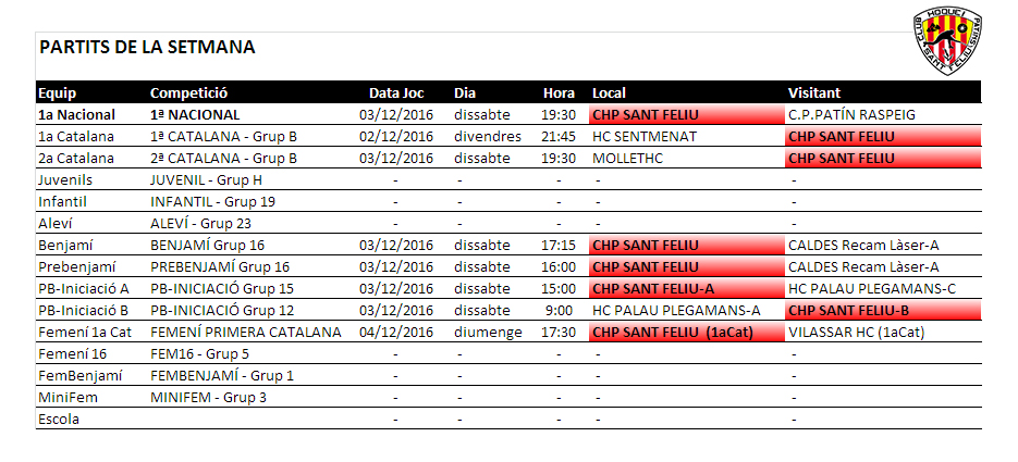 Us informem dels propers partits d’hoquei en els que participaran els equips del nostre Club Hoquei Sant Feliu de Codines. Seran aquest proper cap de setmana, divendres 2, dissabte 3 i diumenge 4 de desembre de 2016.
