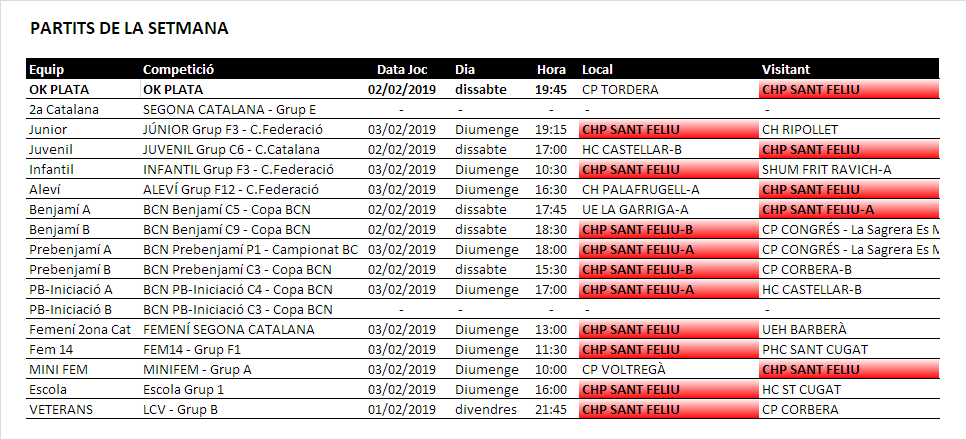 La resta d’equips segueixen les respectives competicions, excepte el PreBenjamí B. Us destaquem el partit que el Júnior juagarà diumenge a la tarda al nostre Pavelló, a les 19.15h, amb el Ripollet.