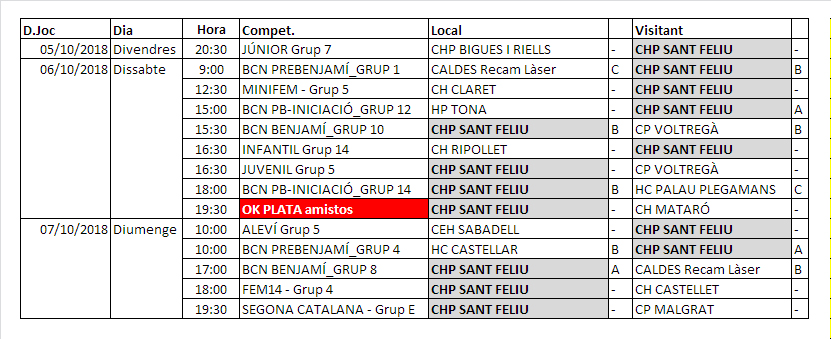 Com veieu aquest cap de setmana ja tenim tots els equips en joc, el OK Plata en amistós amb el Mataró a les 19.30h al Pavelló, l’Escola que van fent i els veterans que descansen ja que la setmana passada van caure a la eliminatòria de la Supercopa i en unes jornades arrancaran la lliga.