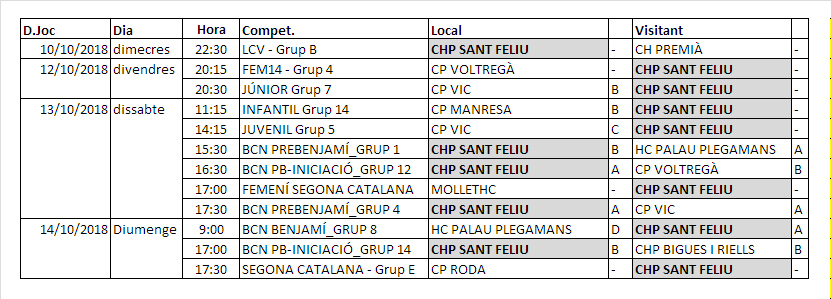 Us informem dels propers partits d’hoquei patins d’aquesta setmana, avui dimecres 10, divendres 12, dissabte 13 i diumenge 14 d’octubre de 2018.