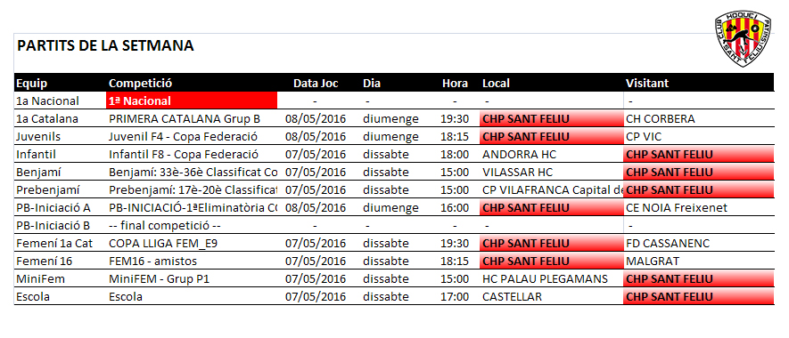 Us informem dels partits d’hoquei patins dels equips del nostre Club Hoquei Sant Feliu de Codines previstos pel proper cap de setmana, dissabte 7 i diumenge 8 de maig de 2015.