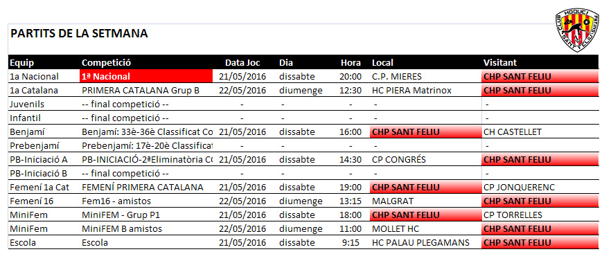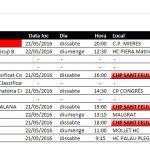 Els equips que no surten a la llista, Juvenil, Infantil, PreBenjamí Inciació B, Femení 16 i Mini Fem ja han acabat les lligues i torneigs, tot i que alguns disputaran partits amistosos com s’ha detallat.