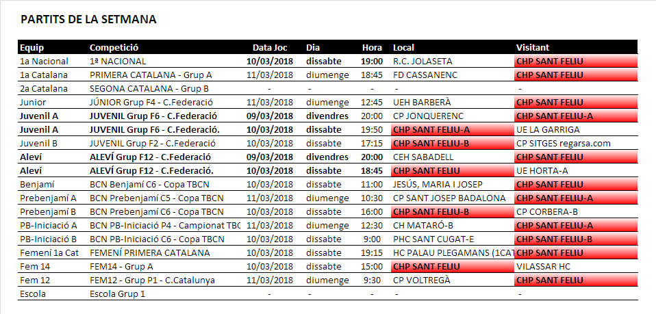 Us informem dels partits d’hoquei patins dels equips del nostre Club d’aquest proper cap de setmana dissabte 10 i diumenge 11 de març de 2018, que seran: