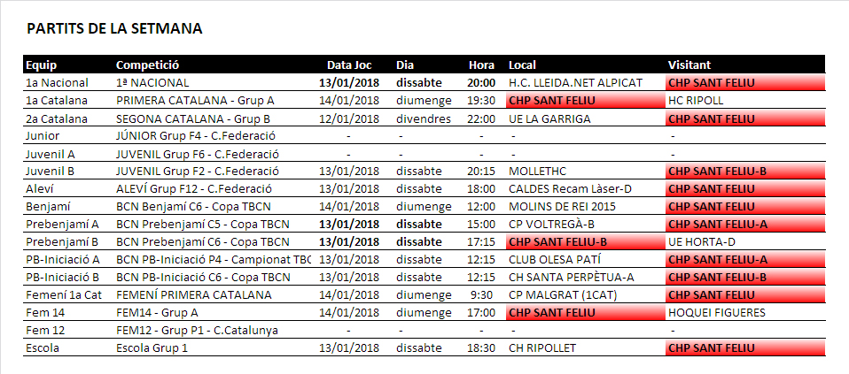 Partits d’hoquei del proper cap de setmana dissabte 13 i diumenge 14