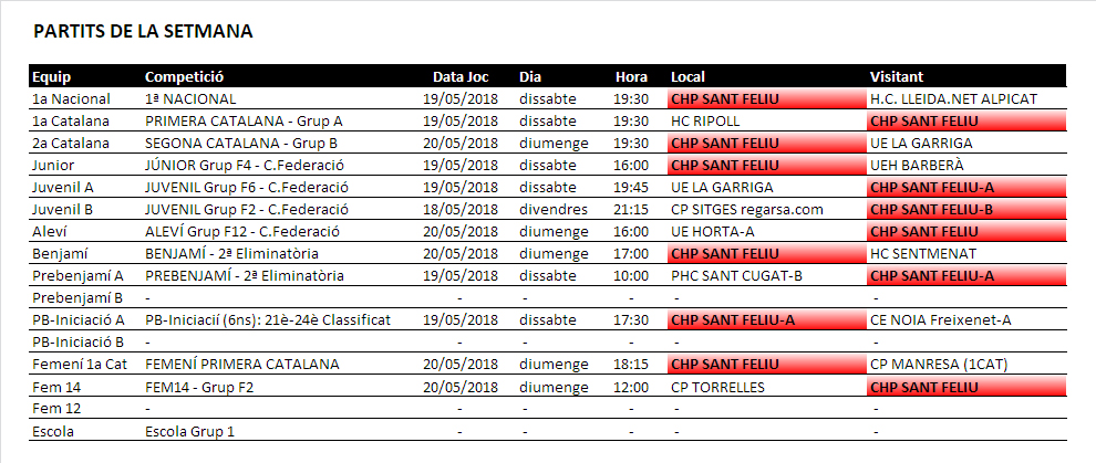 Us informem dels partits d’hoquei patins dels equips del nostre Club Hoquei Sant de Codines d’aquest proper cap de setmana, divendres 18, dissabte 19 i diumenge 20 de maig de 2018.