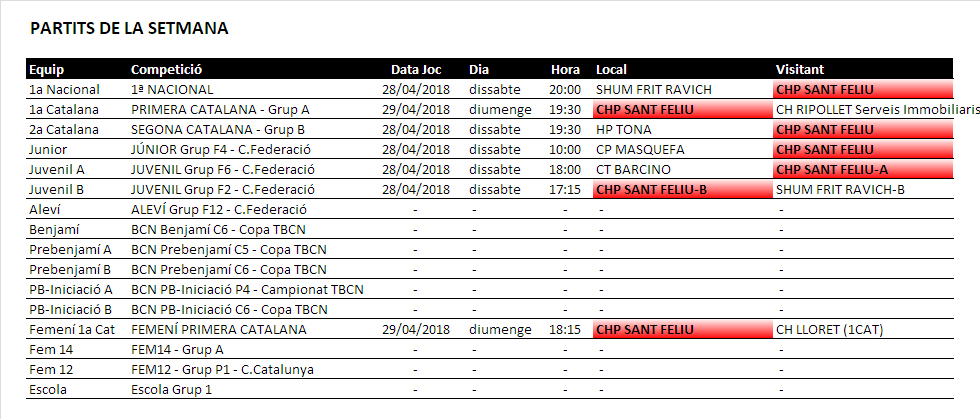Us informem dels partits d’hoquei patins dels equips del nostre Club Hoquei Sant de Codines d’aquest proper cap de setmana, dissabte 28 i diumenge 29 d’abril de 2018.