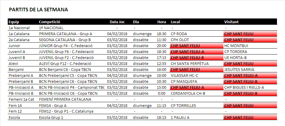 Us informem dels partits d’hoquei patins dels equips del nostre Club d’aquest proper cap de setmana dissabte 3 i diumenge 4 de febrer de 2018, que seran: