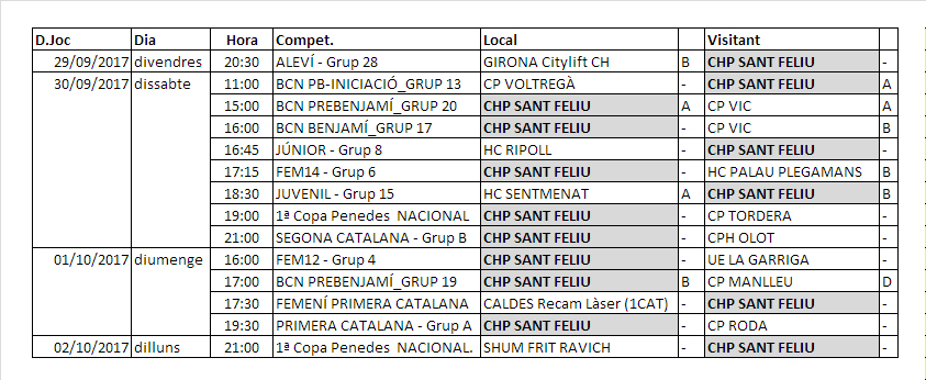 Home Calendaris i Horaris/Partits d'hoquei del proper cap de setmana dissabte 30 i diumenge 1 PartitsSetmana2