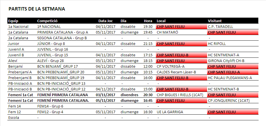 Partits d’hoquei del proper cap de setmana dissabte 4 i diumenge 5