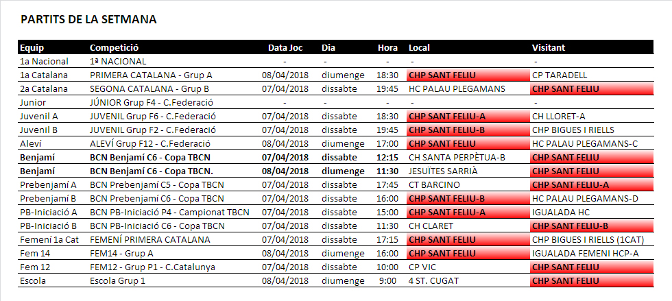 Partits d’hoquei del proper cap de setmana dissabte 7 i diumenge 8