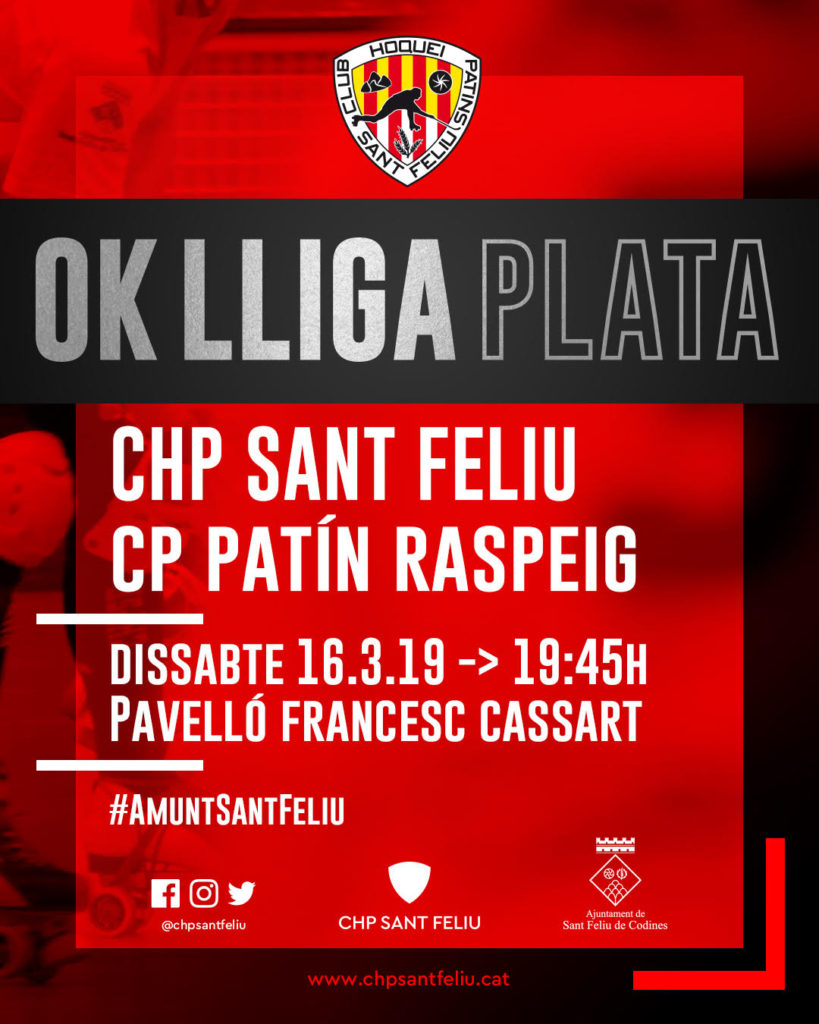 Aquesta setmana el OK Lliga Plata juga el dissabte al Pavelló a les 19.45 amb el CP Patín Raspeig en el que serà un ajustadíssim partit, necessitem el suport de tota la afició i la grada plena, us hi esperem!
