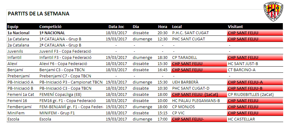 Us informem dels propers partits d’hoquei patins dels equips del nostre Club Hoquei Sant Feliu de Codines, el proper dissabte 18 i diumenge 19 de març de 2017.