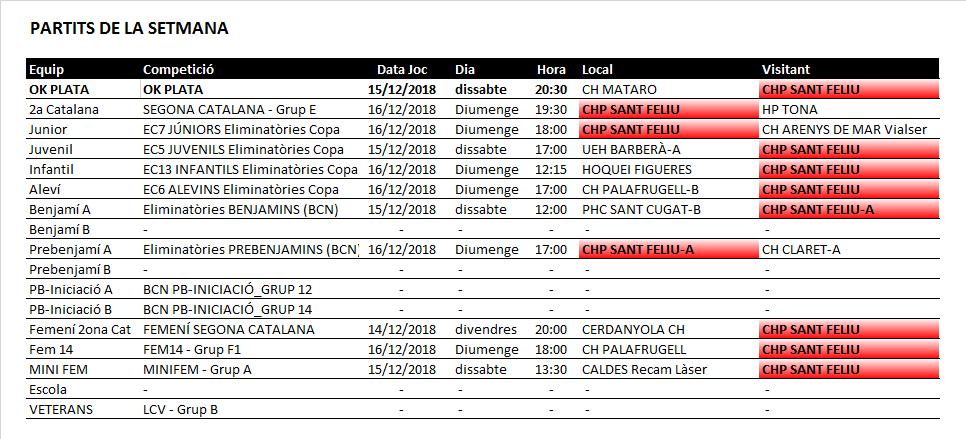 Us informem dels propers partits d’hoquei patins dels equips del nostre Club Hoquei Sant Feliu de divendres 14, dissabte 15 i diumenge 16 de desembre de 2018.