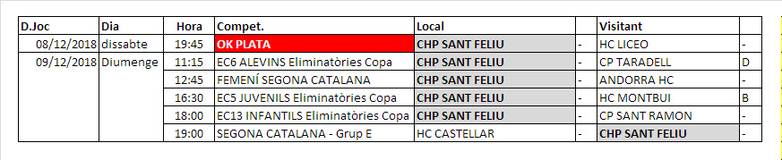 Us informem dels propers partits d’hoquei patins dels equips del nostre Club Hoquei Sant Feliu de dissabte 8 i diumenge 9 de desembre de 2018.