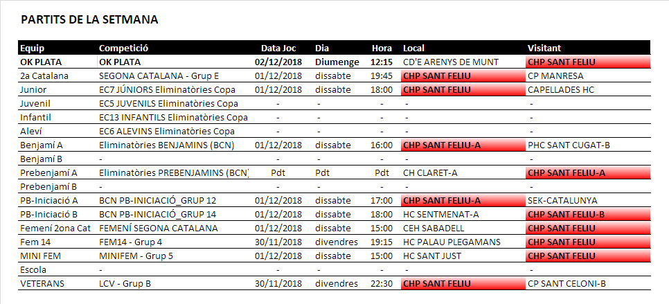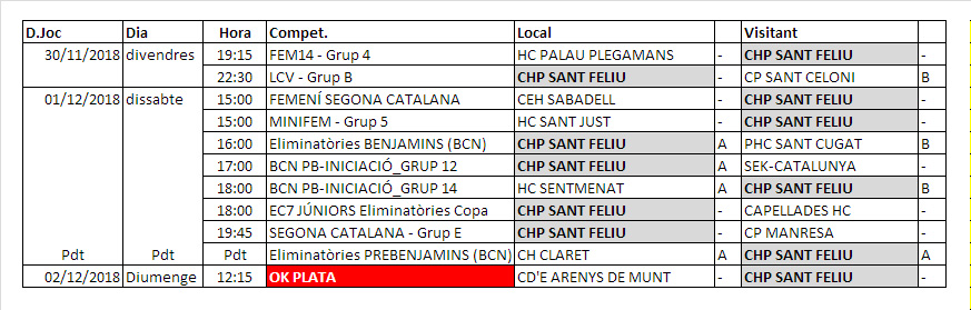 Us informem dels propers partits d’hoquei patins dels equips del nostre Club Hoquei Sant Feliu de divendres 30, dissabte 1 i diumenge 2 de desembre de 2018.