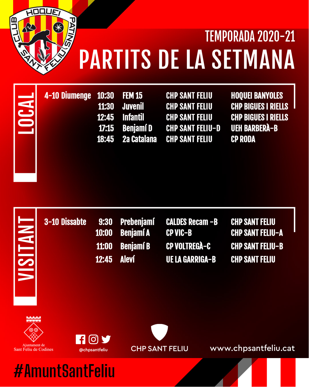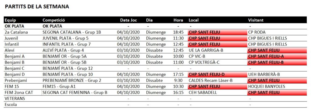 Aquí teniu el detall de tots els partits d’hoquei patins que jugaràn els nostres equips aquest proper cap de setmana, el dissabte 3 i el diumenge 4 d’octubre de 2020
