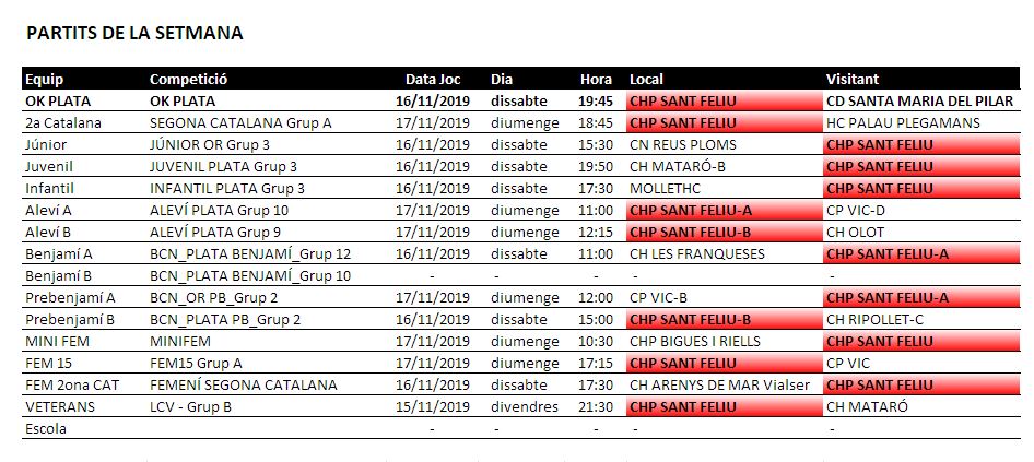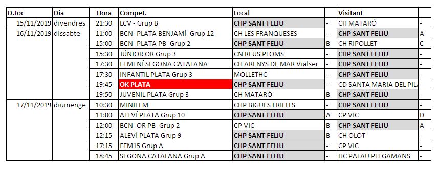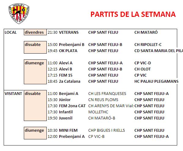 Us destaquem els partits del OK Plata el Dissabte a la tarda a les 19.45h amb el CD Santa Maria del Pilar. L’endemà partit del Segona amb el Palau en el que ven segur serà un partit emocionant. I si voleur aperitiu divendres amb els incombustibles Veterans que rebràn la visita del Mataró. I com no tots els partit de Fèmines i de Hoquei Base.