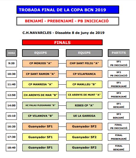 REMARCAR QUE EL PREBENJAMÍ  INICIACIÓ A aquest dissabte participarà en la TROBADA FINAL DE COPA que es fa a NAVARCLES. Quadre adjunt.