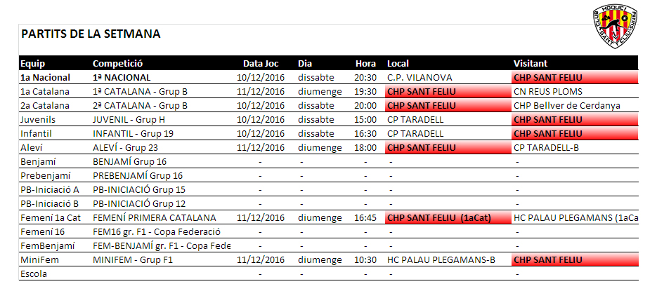 Us informem dels partits del proper cap de setmana, dissabte 10 i diumenge 11 de desembre